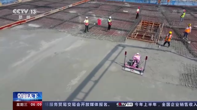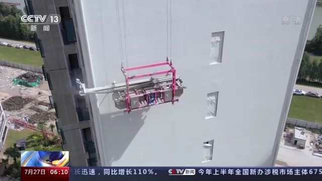 而在广东江门的这个建筑工地,建筑机器人甚至实现了多台搭配作业。智能随动式布料机将刚刚搅拌好的混凝土铺在楼面,随后地面整平机器人和抹平机器人再依次作业,将混凝土均匀平整,原来需要十几人完成的布料工作现在只需要8个人就能完成;另一边,墙面打磨机器人、喷涂机器人等在房间内进行装修作业,效率能达到传统的2到3倍。在业内专家看来,建筑机器人的大范围使用,将极大推动智能建造水平的发展。