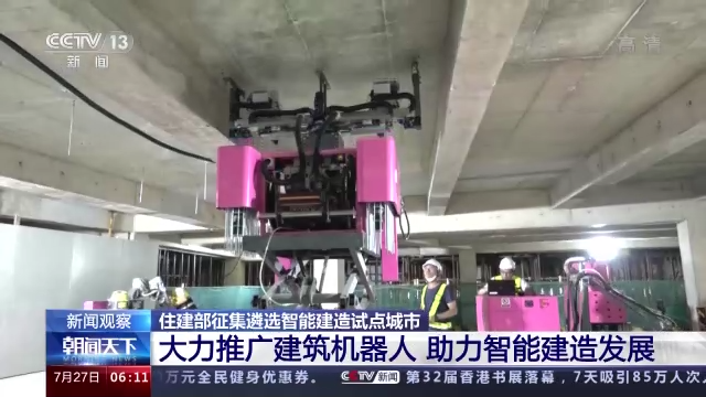 悬挂式布料机器人,这是今年刚在武汉投入使用的新型建筑机器人。它悬挂安装于住宅造楼机下方,可以实现自主作业、精准分区布料,能提高工作效率15%以上。而在重庆两江新区的这个建筑工地上,这台地面整平机器人正在烈日下作业。这种机器人施工工效达每小时150平方米以上,可实现楼地面一次成型,施工效率、整平精度均比人工作业高出不少。