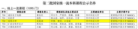 2023年4月11日,教育部高等教育司对第二批国家级一流本科课程认定结果进行了公示,共认定5751门课程,其中,线上课程1095门,虚拟仿真实验教学课程472门,线上线下混合式课程1801门,线下课程2076门,社会实践课程307门。公司龙晓鸿教授及课程组建设的《结构力学》课程获批国家级一流本科课程(线上)。
