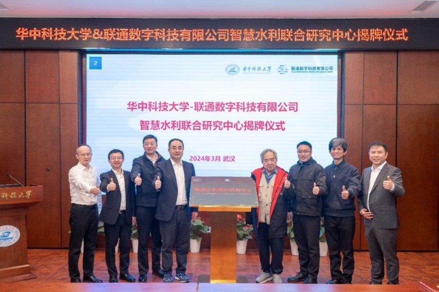 张勇传院士、于俊清副董事长、联通数科魏春城高级副总裁、杨海明首席技术官、重大项目交付部唐菁总经理、中国联通生态环境服务部成湘龙总监、中心刘懿主任共同为智慧水利联合研究中心进行揭牌。
