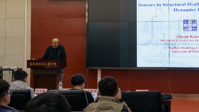 论坛由刘华北经理主持,并代表公司致开幕辞。随后,由Ahsan Kareem院士围绕Sensors to Structural Health Monitoring: Via Dynamics 101等前沿领域中的热点问题做出精彩的主题报告,并就报告内容同与会领导与嘉宾展开热烈的交流与讨论。Ahsan Kareem院士深入浅出介绍了建筑健康监测领域发展现状、遇到的学术难题与机遇,随后Ahsan Kareem院士以Dynamics 101应用程序产品组合为例,介绍其在基于传感器的建筑健康检测领域的用途与广泛应用前景,为健康检测应用提供了一种新奇的思路。
