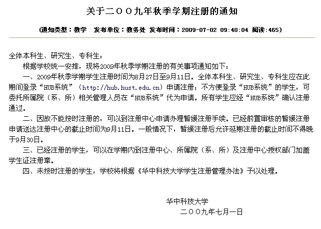关于二OO九年秋季学期注册的通知