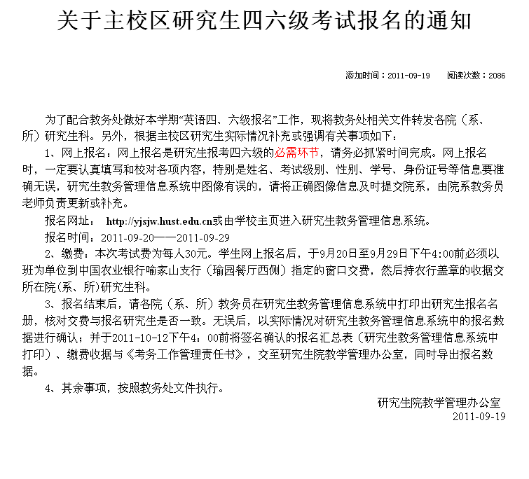 关于2011年12月全国大学英语四、六级考试报名工作的通知
