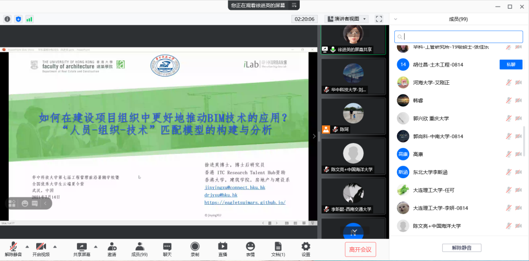 香港大学的徐进英博士后带来题目为“如何在建设项目组织中更好地推动BIM技术的应用?‘人员-组织-技术’匹配模型的构建与分析”的报告。
