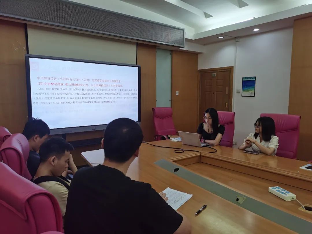 支部汪宇思同志带领大家共同学习《信访工作条例》的出台背景、重大意义、主要内容与贯彻落实。《条例》以习近平新时代中国特色社会主义思想为指导,深入贯彻习近平总书记关于加强和改进人民信访工作的重要思想,总结党长期以来领导和开展信访工作经验特别是党的十八大以来信访工作制度改革成果,坚持和加强党对信访工作的全面领导,理顺信访工作体制机制,是新时代信访工作的基本遵循。汪宇思同志提出,《条例》是坚持人民至上,保持党和政府同人民群众的血肉联系的重要举措,我们应当加强对《条例》的学习,对《条例》规定入心入脑、见行见效,更好担负起为群众解难、为党分忧的职责使命。