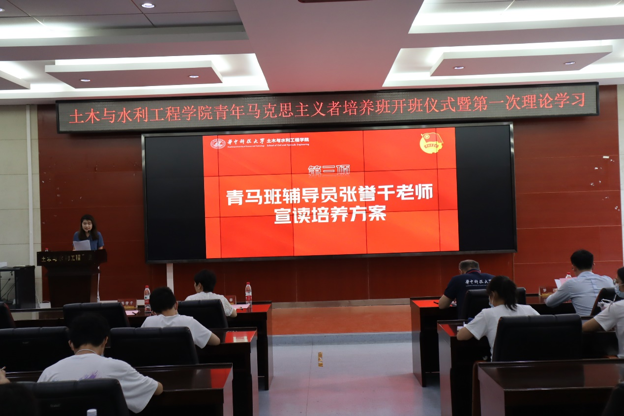 随后,青马班辅导员张誉千老师宣读培养方案。张誉千老师分别从培养目标、培养对象、培养内容、保障机制、考核体系等五个方面介绍了青马班的实施方案,让学员们对自己所处的班级都有了更深的了解。