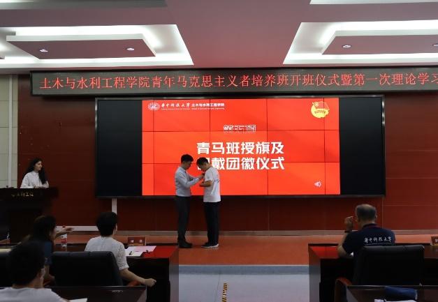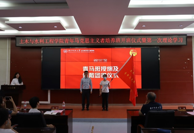 随后,由校团委副书记罗迪老师为青马班授旗,为青马班成员代表佩戴团徽。旗帜交接,舞动的旗帜从此交到我们手中:团徽闪耀,建设更好的青马班从此成了我们的心之所向。