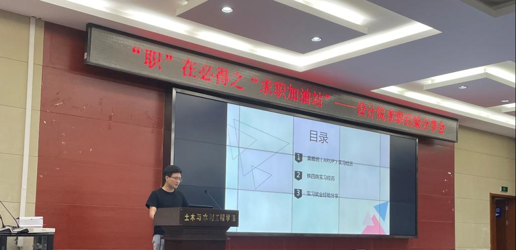 然后结构工程专业的樊晨阳学长向同学们分享了自己在奥雅纳和铁四院的实习经历与感受,认为实践让自己不再迷茫,对结构设计的认识与理解更加深刻,鼓励大家拓宽个人职业视野,积极尝试,提倡同学们未来的求职方向顺应国家的发展方针,认识自己、明确个人定位并保持耐心与自信。同时樊晨阳学长建议同学们在简历中突出实习和科研工作经历,尽可能贴合企业岗位需求,并多用数字描述个人成果。