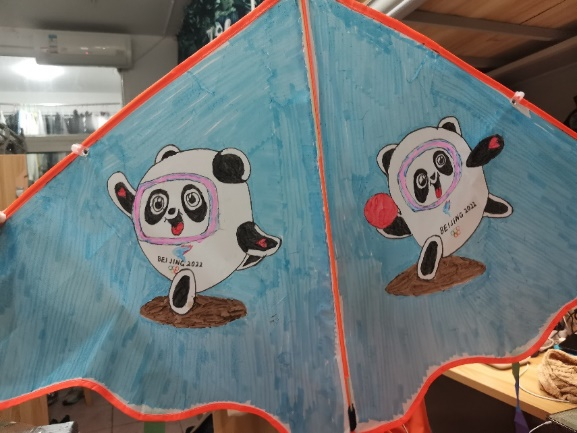 冰墩墩是风筝的主元素,冰雪蓝是风筝的背景色。