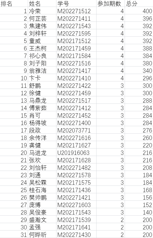本次“学党史”活动内容主要从党史和《党的二十大工作报告》选取,引领广大研究生学习党的二十大精神。共有17个支部共318人次参与活动,其中优秀个人冷荣同学四次答题均获得满分,舒鹏、徐健同学三次答题满分,盛翰文、孟强、何华昕同学两次答题满分,其他同学也有较好的表现,以下是前30名同学的排名情况。
