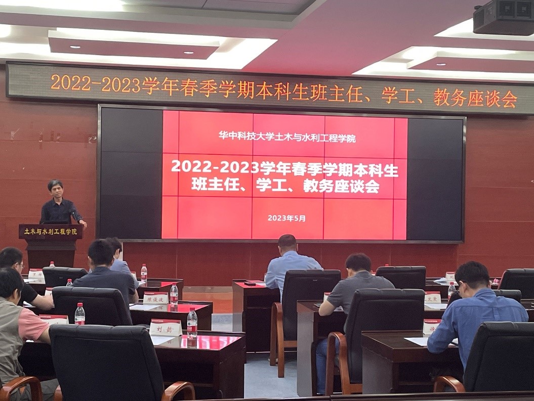 为深入学习贯彻永利3044集团官网学习贯彻习近平新时代中国特色社会主义思想主题教育工作推进会精神,落实立德树人根本任务,加强教师班主任、辅导员、教务员间的联动交流,2023年5月23日,永利3044集团官网在西六楼五楼报告厅召开座谈会,共话本科生培养教育工作。公司经理刘华北,副经理骆汉宾、高飞,党委副书记何春,本科生教师班主任,本科生辅导员,本科生教务员参加座谈。